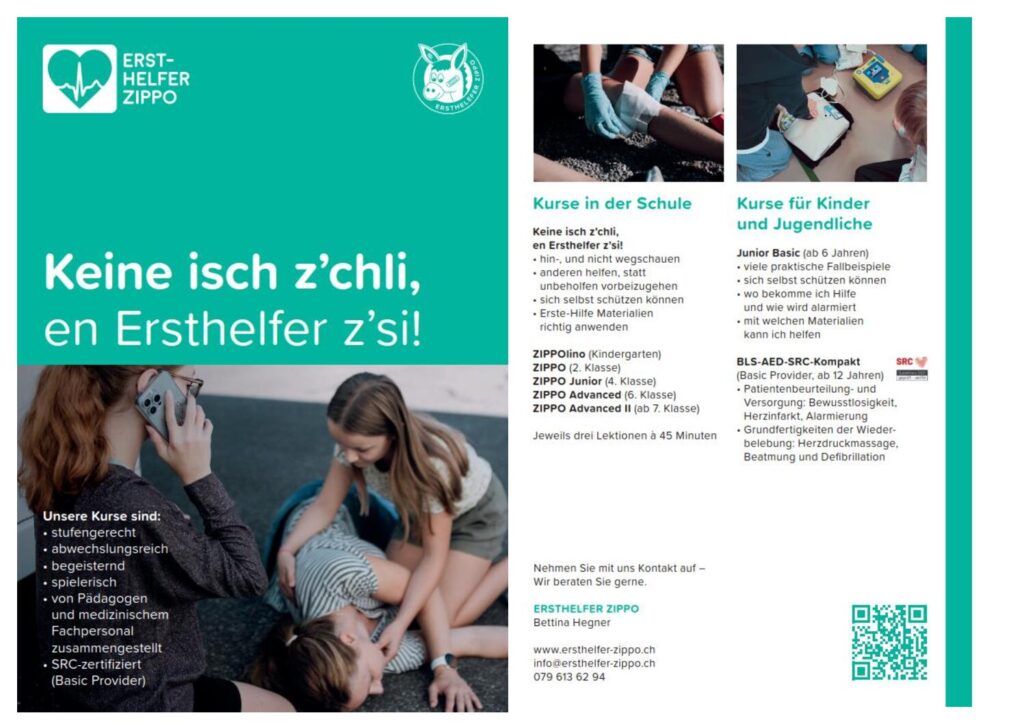 Wir finden es wichtig, dass Kinder ab dem Kindergarten-Alter stufengerecht geschult werden. Sie sollen lernen, wie sie sich in einem Notfall zu verhalten haben. Dass sie eben hin-, und nicht wegschauen. Dass sie andern helfen, statt unbeholfen vorbei zu gehen. Dass sie sich selber und andere schützen können.